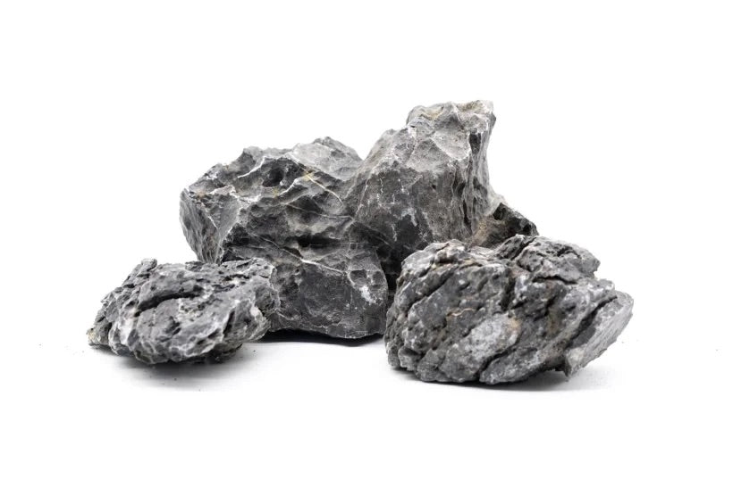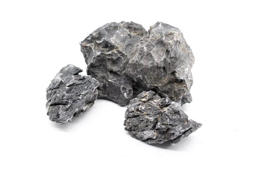 Seiryu Stone delivers striking visual contrast to planted aquariums with its distinctive bluish-grey coloring and white veining. Hand-selected stones range from 6–25 cm and pair beautifully with live plants for dimensional designs. Note that Seiryu Stone may slightly elevate pH and water hardness.